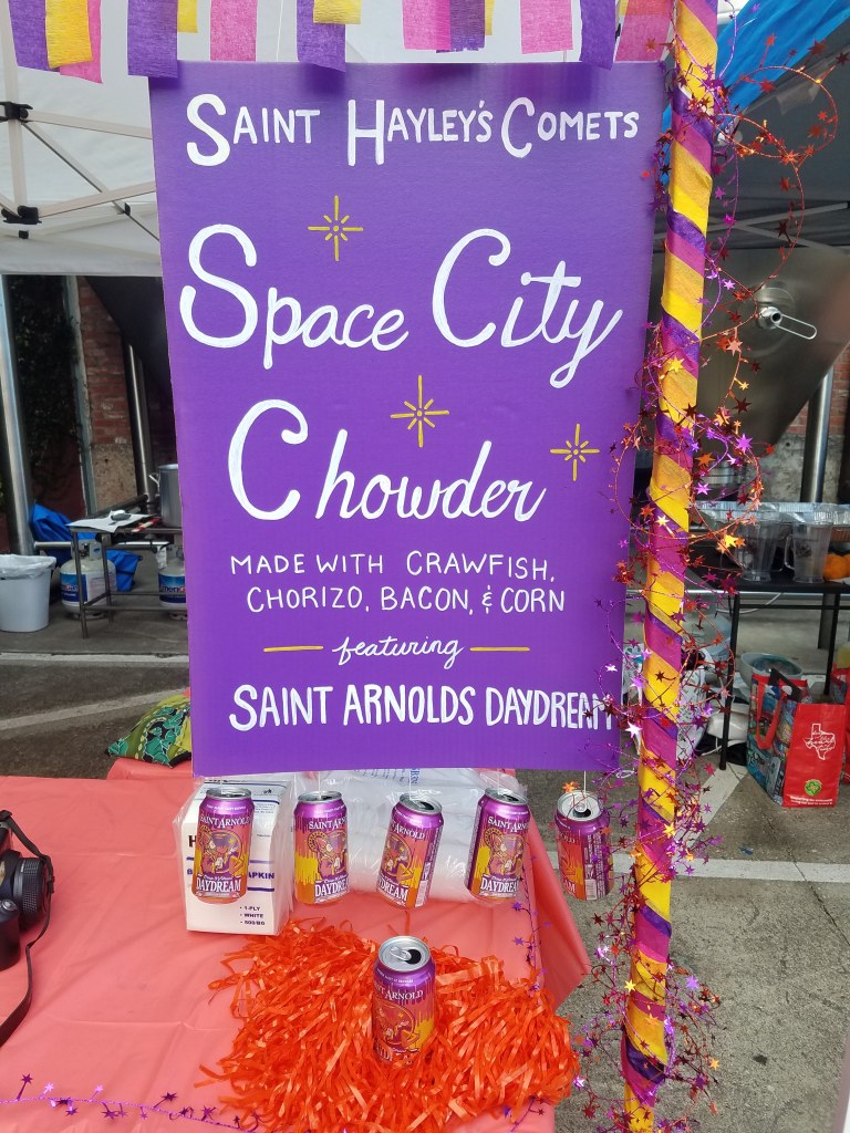 Recently I attended an event sponsored by Saint Arnold’s Brewery known as “One-Pot Showdown”.  This annual event has been held for the past 13 years at the brewery and features 80 teams (each team – four individuals) competing to win the distinction of having prepared the best dish (e.g., chili) “in a single pot”.  Everyone’s recipe must incorporate one or more of Saint Arnold’s beers – and the wonderful selection of available beers adds to the variety of dishes.  This Houston event, held the weekend before the Super Bowl, is extremely popular and tickets to attend sell out early.  The competition benefits Kid’s Meals, an organization that provides healthy lunches to preschool-aged kids living in poverty.  I participated in a team last year and our team made a crawfish and corn chowder we named “Space City Chowder”.  To our pleasant surprise, our team (Saint Hayley’s Comets) was judged to be one of the 16 finalists (which we figured probably made us 4th since 1st, 2nd, and 3rd places were specifically named). But, regardless of our actual place, it was a lot of fun cooking, enjoying St. Arnold’s beer, and also sampling the fixings of other teams.  And while we didn’t compete again this year, we sampled lots of great food.