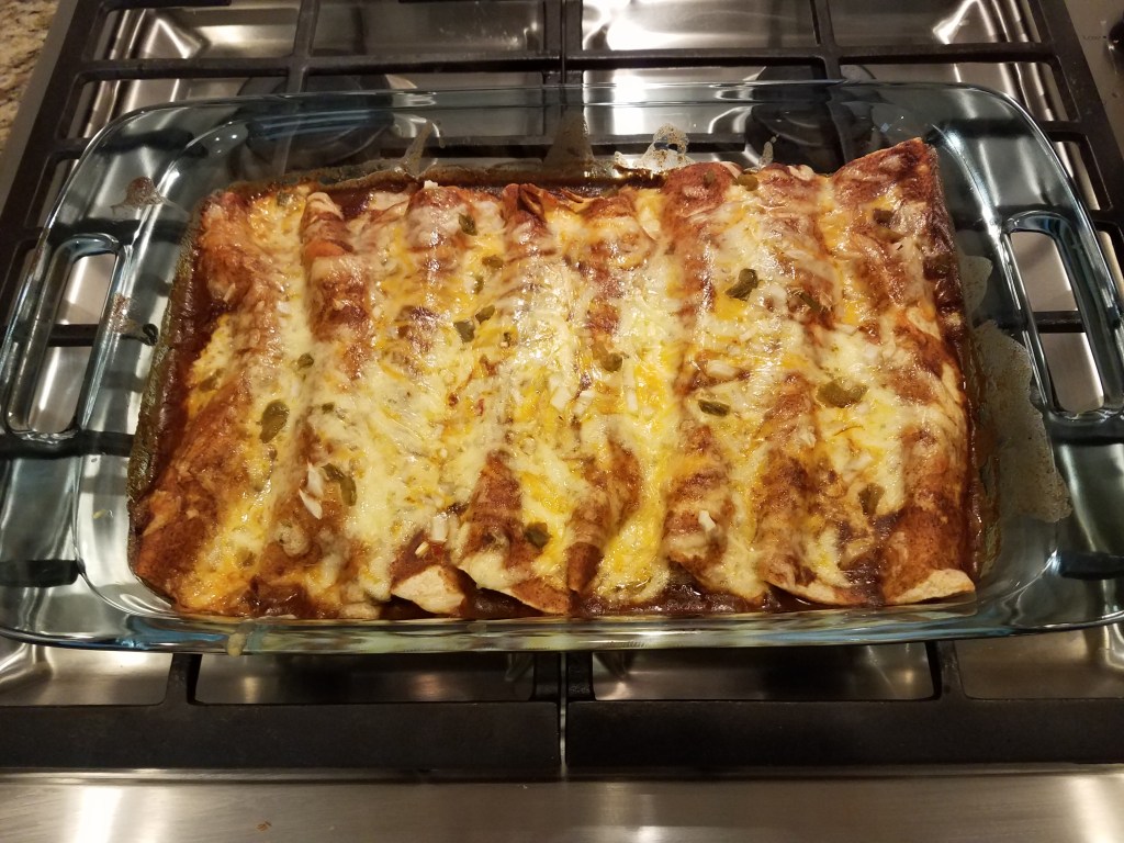 In a separate skillet, brown the Impossible Meat. Stir in a few tablespoons of the sauce after draining meat. Prepare each enchilada by spreading a few spoonfuls of sauce on a tortilla, add 1/8 of the meat mixture, a portion of the Colby cheese, and a small portion of the chopped onion. Place the rolled enchiladas in a glass baking dish, placing the rolled seam down. Pour the remaining sauce over the pan of enchiladas. You’ll probably have more sauce than needed so you can freeze any extra. Sprinkle Colby cheese and Monterrey Jack cheese and optionally, add a few Jalapeno peppers and chopped cilantro. Bake 25 minutes at 3500. Garnish with diced white onion after cooking.