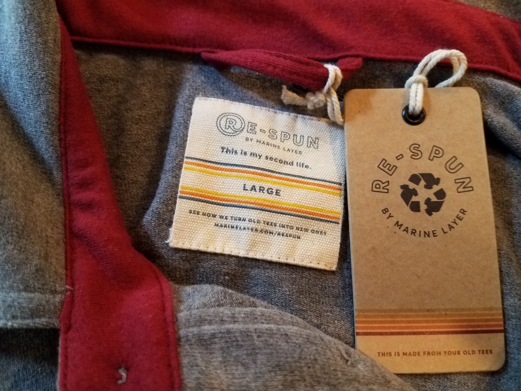The shirt’s label revealed it was made by a company, Marine Layer, using the product name “Re-Spun”. The label further explained “You gave us worn-out tees and we re-spun them into what you’re about to wear.  Cheers to keeping textiles out of landfills – one tee at a time.”   Looking at the company’s web-site, I learned Marine Layer accepts old-tee shirts (and pays for the shipping) and uses those tees to make new ones.  The new “re-spun” material is 25% “upcycled” (i.e., donated and broken down) cotton; 35% recycled plastic (e.g., plastic water bottles); and 45% Tencel Lyocell (made from the wood pulp of Eucalyptus trees).  Using this new, repurposed fabric, “new” clothing is made. Where is it made? “Most of our stuff comes from SF or LA, where some of the best knits in the world are made. For some of the more technical styles, we turn to sewers overseas that work in the same ethical and sustainable factories we’d use here.”